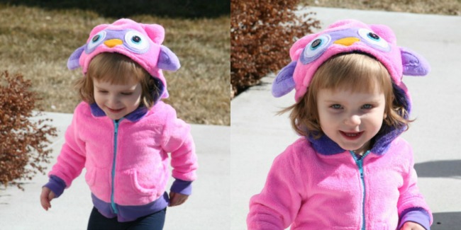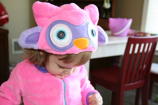 My daughter and I both love Milo the Owl.  First, she makes a nice warm jacket with a cute hood, perfect for the spring weather that I hope will stick around for awhile.  Second, she turns into a soft plush owl for my daughter to play with.  It was so great to put the jacket on her when going to places like church and the doctor’s office, and then to roll the jacket up into the owl to keep her entertained while sitting or waiting (she especially loved playing with Milo’s button eyes!).  It was also easy to carry Milo around in her rolled form as well.  It will be nice to take Milo on long trips as both a jacket and a pillow in the car.  And storage will be great as well – I can either hang Milo up on a jacket hook or set her on a shelf in my daughter’s room.